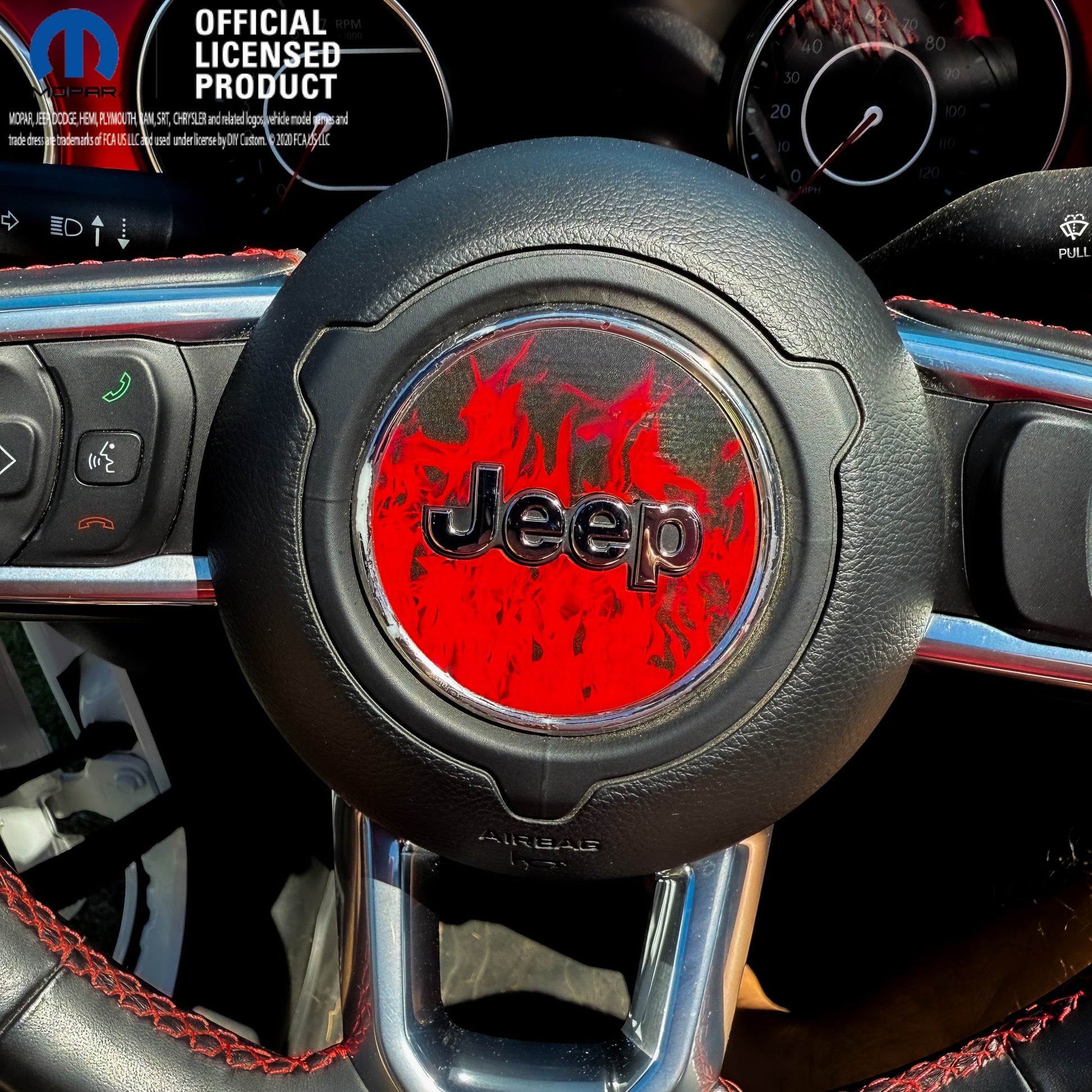 Elevate your ride with our Officially Licensed Jeep® Red Flames steering wheel decals, the perfect way to showcase your passion for off-road adventures and the legendary Jeep brand. Crafted from premium, weather-resistant vinyl, these decals are designed to endure rough terrains and harsh elements—while maintaining their vivid colors and crisp details. Whether you’re a proud owner of a Wrangler or Gladiator, our decals add a rugged, personalized touch that stands out on every trail or city street. Easy to apply and built to last, our extensive selection of authentic Jeep decals will help you celebrate the spirit of exploration and freedom. Explore our collection today to find the perfect style that captures your driving adventures and sets your Jeep apart from the rest.